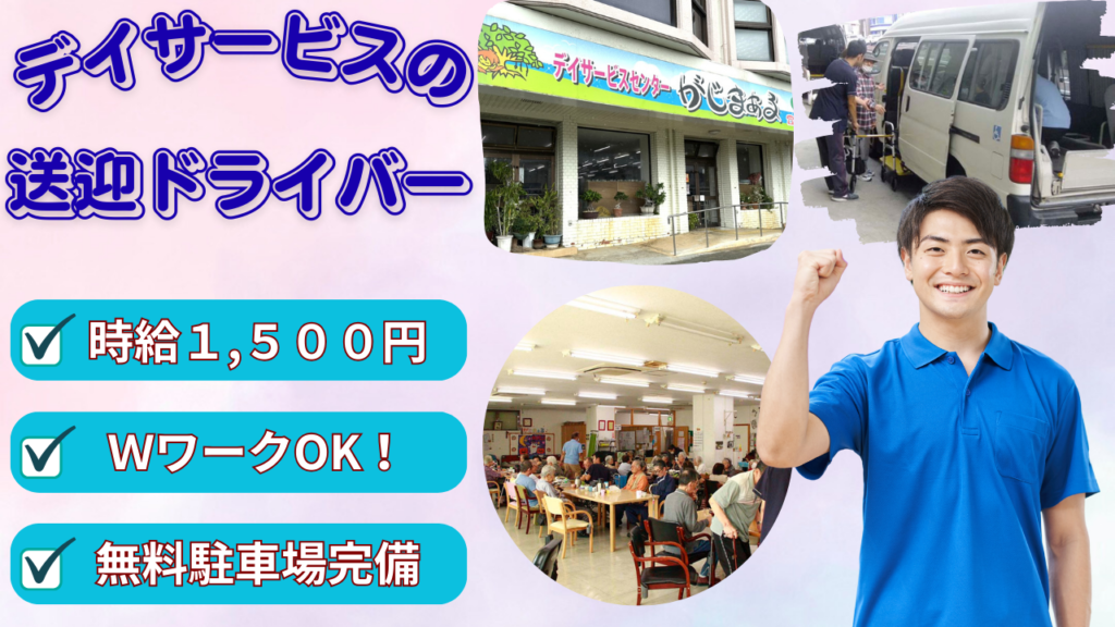 | 仕事内容 | イチオシ!好条件! 宜野湾市でのデイサービス送迎ドライバーのお仕事をご紹介します! ※好条件のお仕事なので、お早めのご検討がおすすめです! 【仕事内容】 デイサービスセンターにて、デイサービス送迎ドライバーを担当していただきます。 主な業務内容 デイサービス利用者を朝夕に送迎する仕事です。 迎車両は普通免許で可能。 1回あたり4~5名、2回で10名程度を送迎します。 短時間勤務のためご家庭やプライベートとの両立も可能です。 ※AT車(ハイエース8名乗り・軽自動車・乗用車)を使用 【お仕事の流れ】 【午前】 8時30分~ 車両準備、利用者迎え、到着誘導 9時30分~ 車両消毒、洗車、給油、点検等 10時30分 業務終了 【午後】 15時30分~ 車両準備、利用者誘導、利用者送り 16時30分~ 利用者誘導、利用者送り、車両消毒 17時30分 業務終了 |