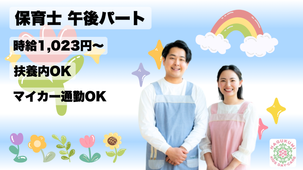 | 勤務時間 | 【勤務曜日】 月~金(週2日以上から応相談)のシフト制 【勤務時間】 14:00~18:30の間で応相談 1日の勤務時間:最大5.5時間まで(扶養範囲内) ※年に3回程度、土曜出勤あり(全体会議・研修・行事:9:00~13:00) |