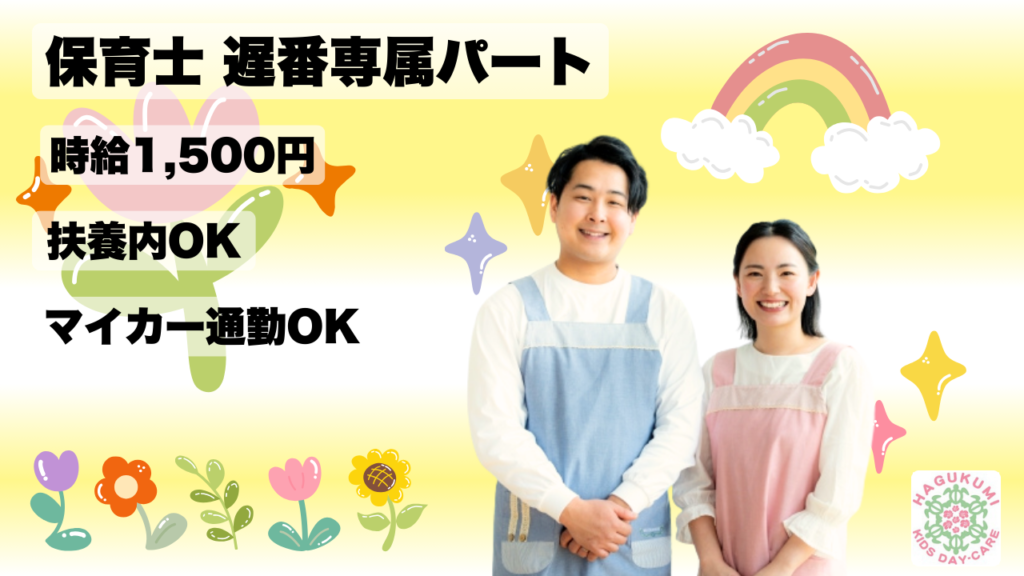 | 勤務時間 | 【勤務曜日】 月~金(週2日以上から相談可能)のシフト制 ※扶養範囲内勤務OK 【勤務時間】 16:00〜19:00の間で応相談 1日の勤務時間:3時間 ※年に3回程度、土曜出勤あり(全体会議・研修・行事:9:00~13:00) |