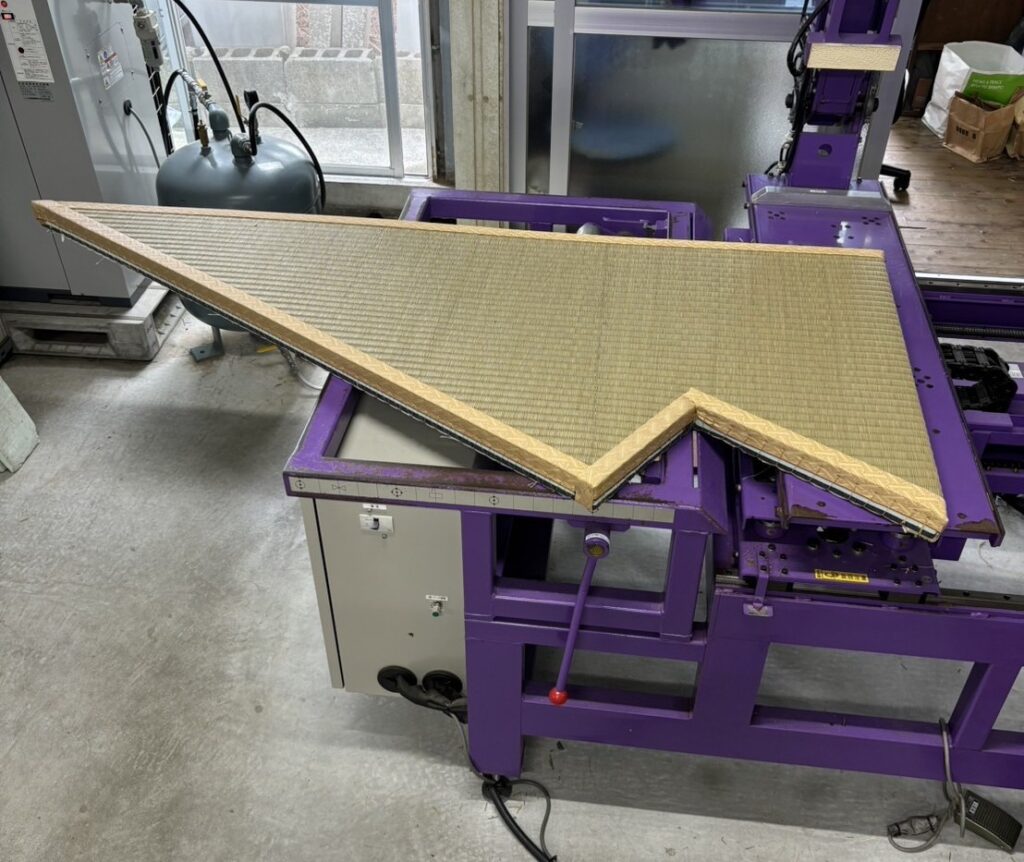沖縄の湿気を考慮した張り加減で、見た目だけでなく、踏み心地や耐久性を重視した仕上げを行います。 こうした作業も、未経験の方でも基本から少しずつ覚えていくことができます。⑤ 畳包丁による切り合わせ 機械による量産作業も取り入れており、 未経験の方でも機械を使って作業できる環境があります。 機械作業と職人技を使い分けることで、 品質を保ちながら効率よく作業できる点が、中部たたみ店の強みです。