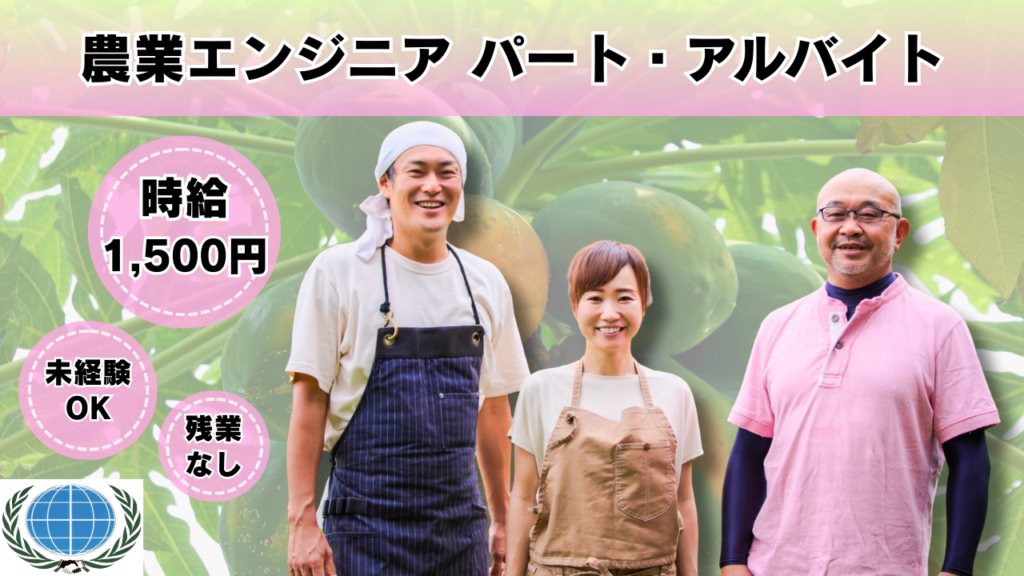 | 求める人材 | ・学歴不問 ・経験不問 ・未経験者歓迎 ・普通自動車運転免許(あれば尚可) \未経験者歓迎/ 学歴不問! 主婦、子育て世代歓迎! 農業未経験の方も応募可! ・農業や自然に興味がある方 ・体を動かす仕事が好きな方 ・未経験から新しいことに挑戦したい方 ・安定した環境で長く働きたい方 ・地域に根ざした仕事をしたい方 ご応募お待ちしております。 直求人専用電話:098-923-0080 直Fax:098-923-5006 |