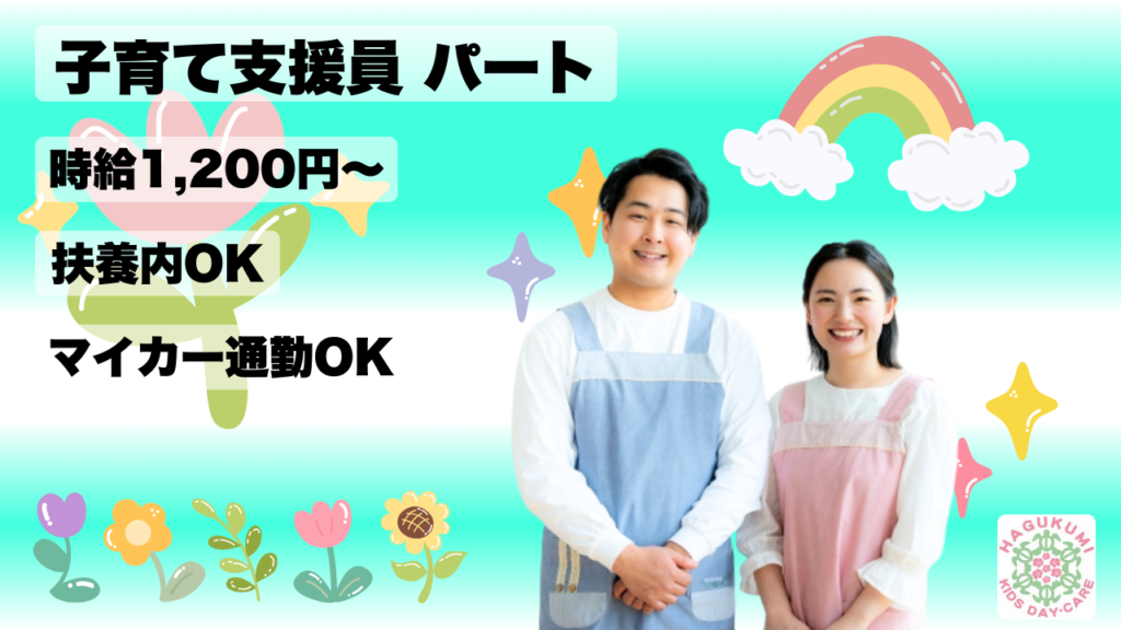 | 勤務時間 | 16:00〜19:00 1日の勤務時間:3時間 ※扶養範囲内勤務OK ※全体会議・研修・行事による土曜出勤(年3回程度/9:00~13:00)あり |